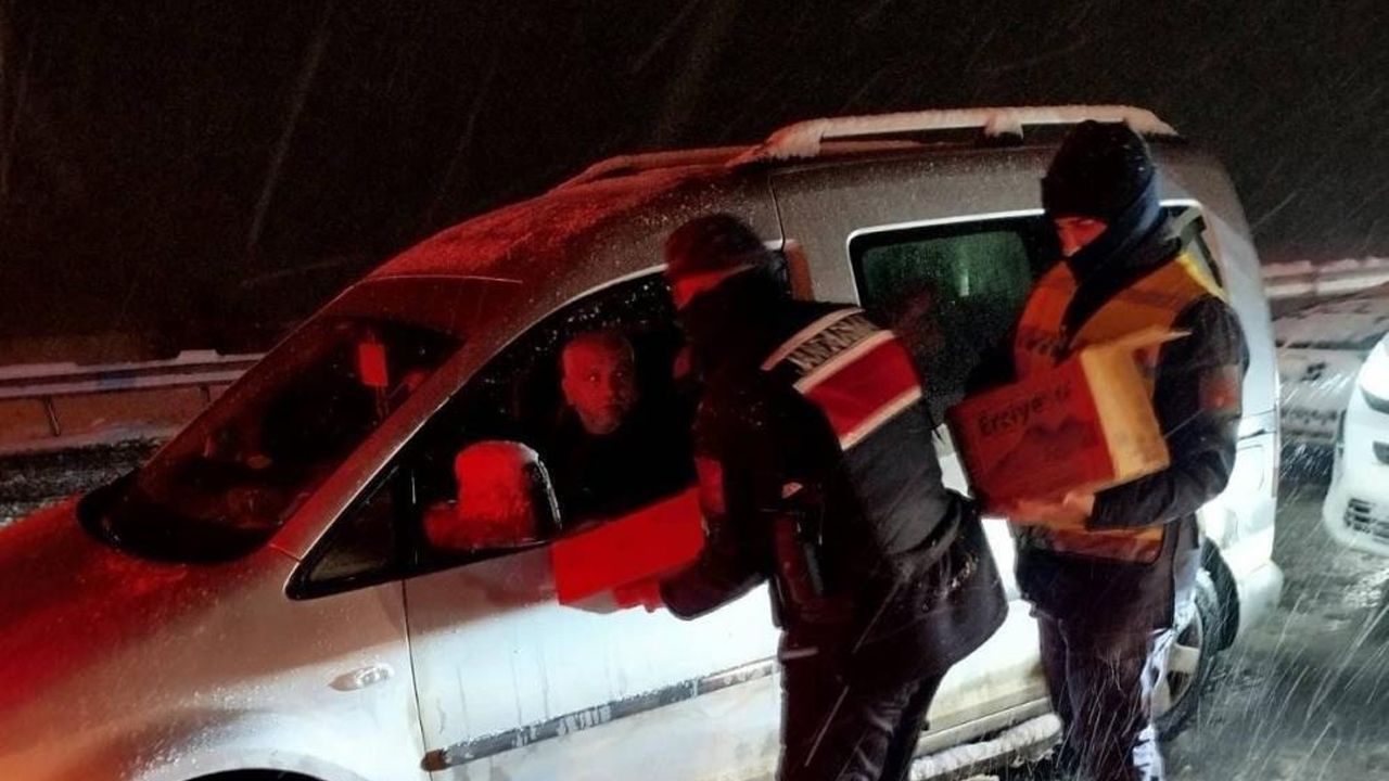Yoğun kar yağışı ve olumsuz hava şartları nedeniyle yolda kalan vatandaşlara Jandarma ve Kızılay ekiplerince yiyecek ve içecek ikramında bulunuldu. Ekipler, zorlu kış şartlarında vatandaşların mağduriyet yaşamaması için yoğun çaba sarf etti.