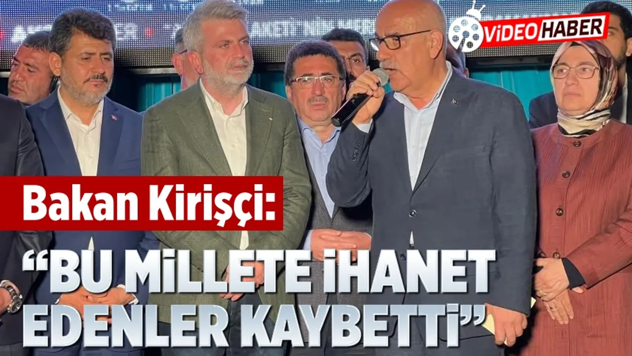 Bakan Kirşci, “Millet kazandı, bu millet kaybetmedi, kaybetmeyecek. 81 milyon bu memleketin evladı tamamı kazandı. Şu kaybedenlere bakalım, şu anda kaybedenler kulübü var. Şu kollarını çemreyerek mutfaktan görüntü veren vardı ya hesap uzmanıyım diyen. Yüzde 1 oy oranı olmayan partiye 40 tane milletvekilini kaptırdı. Aslında bundan bir şey olmayacağı belliydi. İşte onlara bay bay diyoruz. İkinci kaybeden ise masan önce kalkıp 2 gün sonra tekrardan masaya gelen Meral Akşener oldu, ona da bay bay diyoruz. HDP kaybetti, PKK kaybetti, YPG, PYD kaybetti. Bu millete ihanet edenler kaybetti. Başka kimler kaybetti? İstanbul için Ankara için oyları alıp ben sizlere belediye başkanlığı yapacağım diyen, bu zamana kadar herhangi bir hizmeti olmamış sözde belediye başkanları kaybetti. Cumhurbaşkanımızın gerçek oyunu kamuoyundan gizleyip sanki cumhurbaşkanımız yeniliyormuş gibi bütün kamuoyunu yanıltan araştırma şirketleri de kaybetti. Onlara da bay bay diyoruz onlar da gitti” diye konuştu.