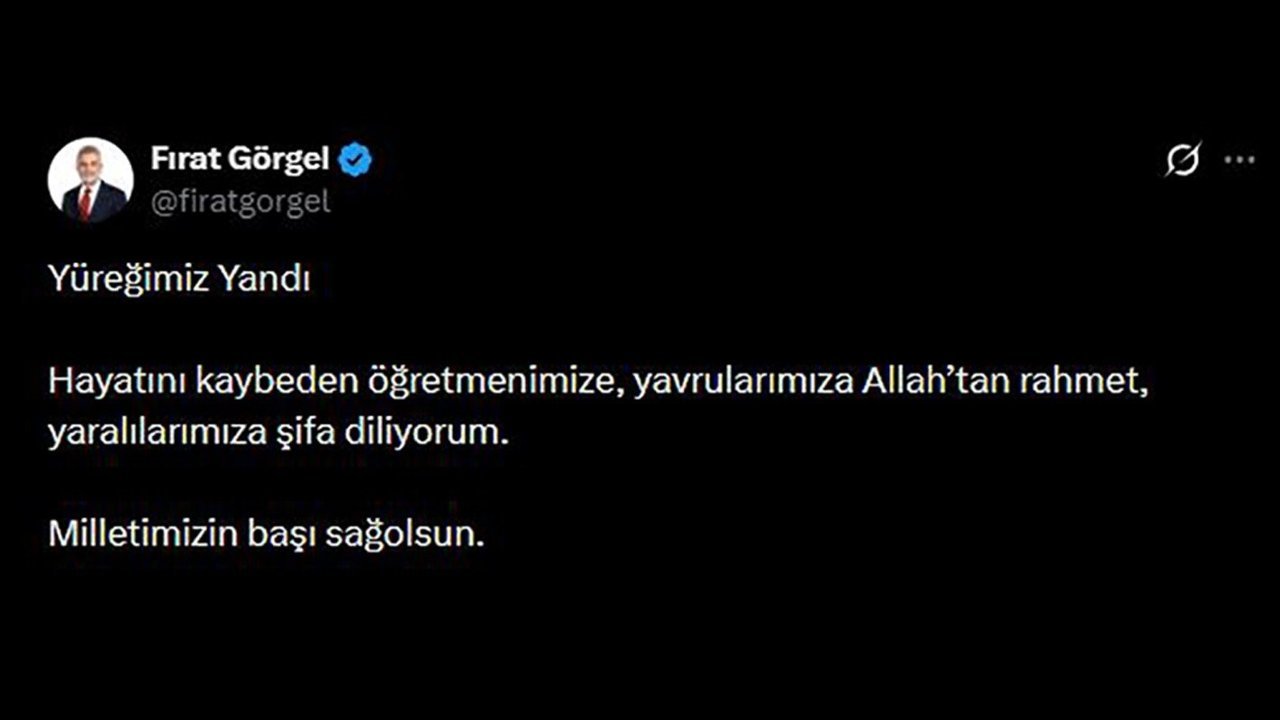 Kahramanmaraş Büyükşehir Belediye Başkanı Fırat Görgel, Onikişubat’taki Ayser Çalık Ortaokulu’nda meydana gelen silahlı saldırıya ilişkin başsağlığı mesajı yayımladı. Büyükşehir Belediye Başkanı Fırat Görgel mesajında, “Hayatını kaybeden yavrularımıza ve öğretmenimize Allah’tan rahmet, kederli ailelerine başsağlığı diliyorum. Yaralanan ve tedavileri devam eden öğrencilerimize de Rabbimden acil şifalar temenni ediyorum. Yüreğimiz yandı, milletimizin başı sağ olsun” ifadelerini kullandı