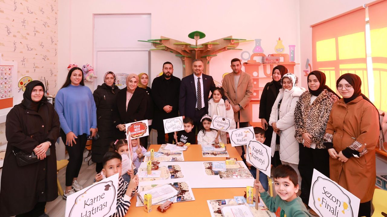 Yarıyıl tatiline girilmesi dolayısıyla düzenlenen programda minik öğrenciler karne heyecanı yaşarken, Başkan Toptaş da bu özel günde çocukları yalnız bırakmadı. Program sırasında hazırlanan doğum günü pastası, miniklerin alkışları eşliğinde kesildi.
