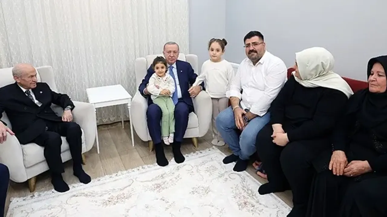Cumhurbaşkanı Recep Tayyip Erdoğan’a ziyarette MHP Genel Başkanı Devlet Bahçeli, TBMM Başkanı Numan Kurtulmuş ve Çevre, Şehircilik ve İklim Değişikliği Bakanı Murat Kurum eşlik etti. Heyet, depremzede ailenin yeni evinde misafir olarak aileyle sohbet etti.