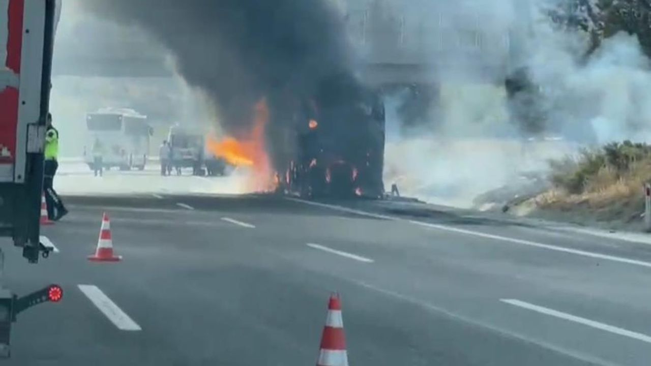 Şoför, durumu fark ederek otobüsü güvenli şeride çekip 34 yolcusunu tahliye edip itfaiye ekiplerine haber verdi.