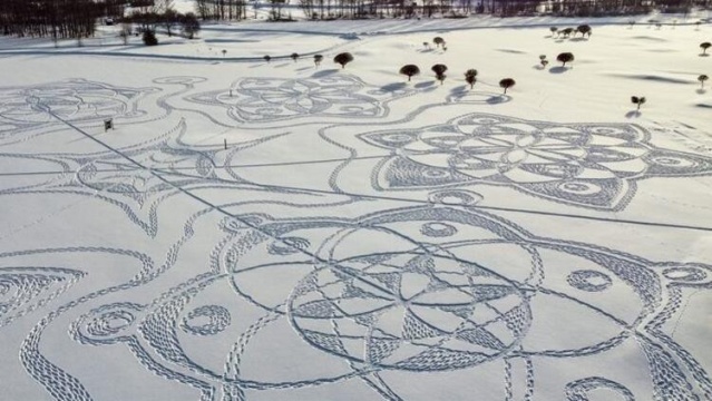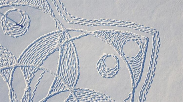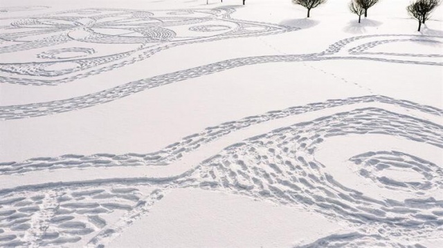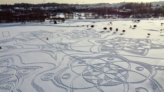 Finlandiya'da bir golf sahasında metrelerce yağan karın üzerine binlerce ayak iziyle yapılan dev geometrik desen büyük ilgi gördü.