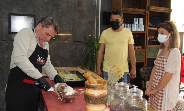 Etlerin geçtiği işlemlerden bahseden Kasap Bedirhan Günbey, “Burada etlerimizi kaya tuzunda 40 ila 60 gün arasında dinlendiriyoruz. Buradaki dinlendirme amacımız etin pişirme seviyesini en az seviyeye indirmek. Burada kendimize özel 15 çeşit baharatımız var. Eti önce baharatlarla beraber dövüyoruz, daha sonra tereyağına bandırıp kaya tuzuna sürtüyoruz. Etlerimizi güzelce marine edip lezzetimize lezzet katıyoruz. Etlerimizi döküm tavayı kızdırdıktan sonra iki yanını da bir buçuk dakika pişiriyoruz ve yemeye hazır hale geliyor” diye konuştu.
