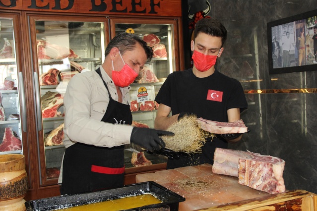 Kasap Bedirhan Günbey, etleri 40 ila 60 gün kaya tuzunda bekletip özel baharatlarla marine ettiklerini belirterek, “Etlerimiz bir buçuk dakikada pişip yemeye hazır hale geliyor” dedi.