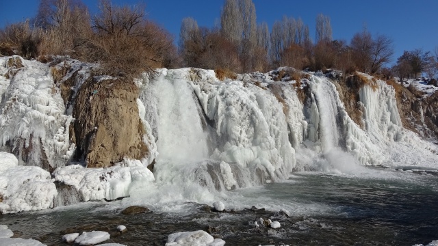 Hava sıcaklığının ocak ayında sıfırın altında 10 dereceye kadar düşmesi, yaz aylarında coşkulu akan suyuyla dikkat çeken Muradiye Şelalesi’nin bir bölümünü buza dönüştürdü.