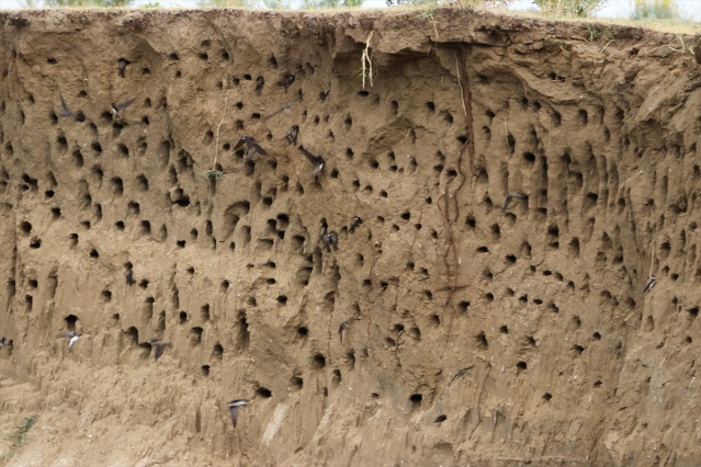 Van'ın Erciş ilçesinde, vatandaşların çeşitli işlerinde kullanmak için toprak taşıdığı tepeye yuva yapan yüzlerce kırlangıç, fotoğraf tutkunlarının ilgi odağı oldu.