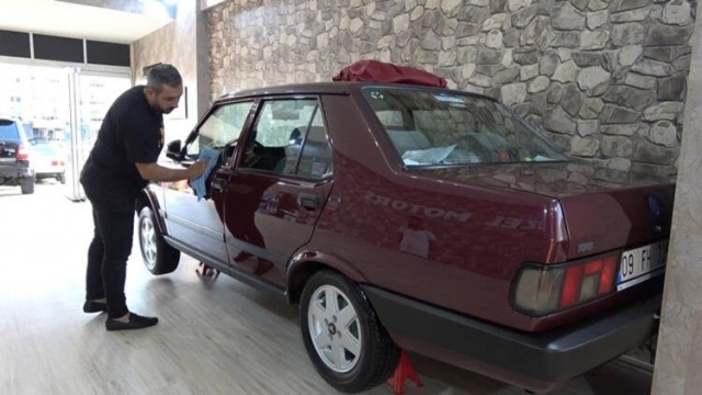Kilometre yazmasın diye kurtarıcı ile getirdiği otomobilini iş yerinde sergileyen Güzel'in 8 bin 500 kilometredeki otomobili orijinalliği ve temizliğiyle görenleri şaşırtıyor.