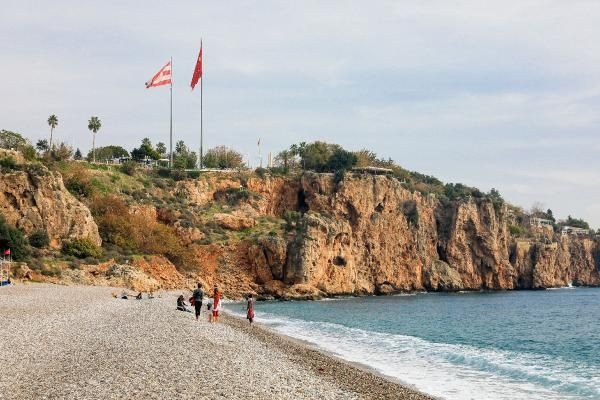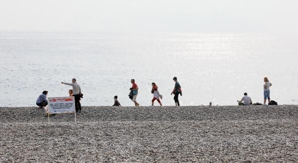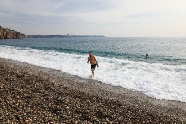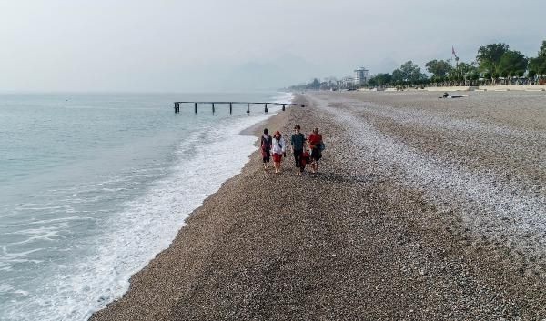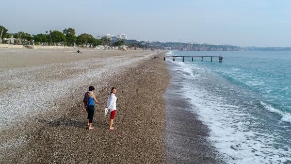 Antalya'nın dünyaca ünlü Konyaaltı Sahili, kısıtlamadan muaf olan turistler ve turizm çalışanlarına kaldı. Kentte deniz suyu sıcaklığı 20 dereceyi buldu.