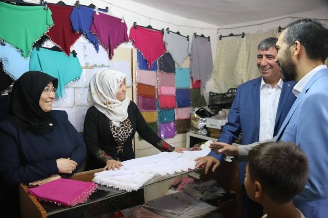 uma namazı sonrasında Sakarya esnafını gezen Özdemir vatandaşların sorunlarını ve taleplerini dinlerken, burada Gaziantep Belediye Başkanı Fatma Şahin'e iğne oyası biz yazma hediye aldı.