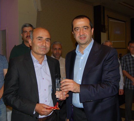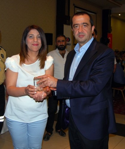 Masaları dolaşarak hoş geldiniz diyen Konukoğlu, daha sonra SANKO’da 10, 15, 20, 25, 30 ve 35 yıldan bu yana çalışan 33 personele, içerisine lazerle fotoğrafları işlenmiş kristal plaket, tam altın ve takım elbise hediye etti.