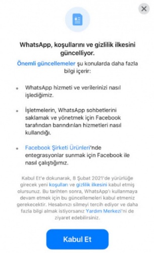 Fakat sözleşmeye onay vermeyenler ise 8 Şubat'tan itibaren WhatsApp'ı kullanamayacak. Bu durum tüm dünyada büyük tepki çekti.