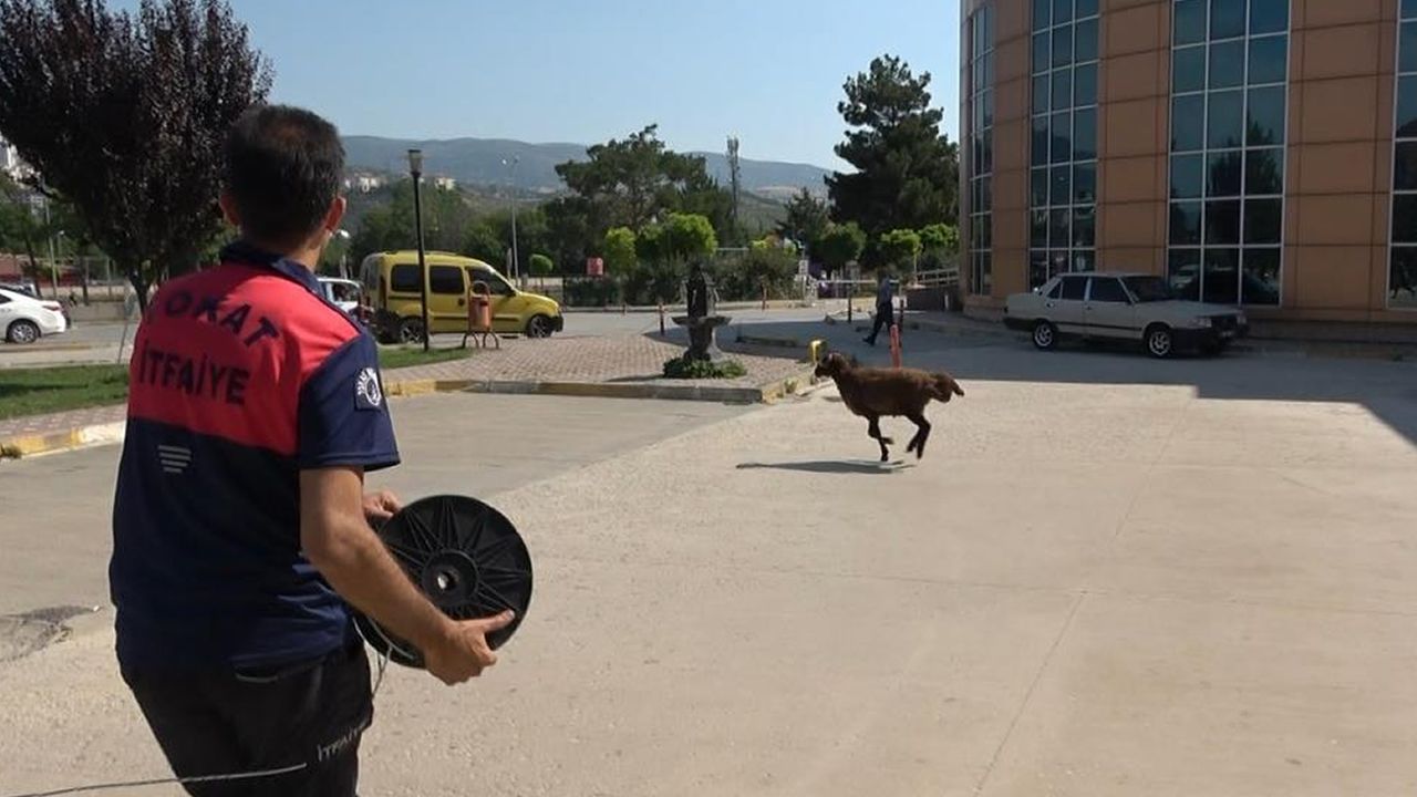 İtfaiye binası karşısındaki Tokat Devlet Hastanesi bahçesine giren koç, hareketli anların yaşanmasına neden oldu.