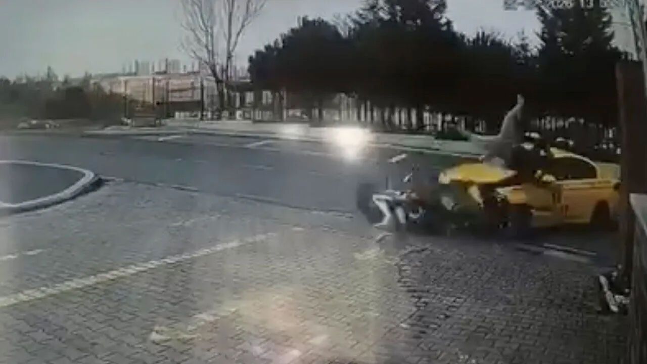 Başakşehir’de taksi ile çarpışan motosiklet sürücüsünün savrularak yaralandığı kaza anı güvenlik kamerasına yansıdı.