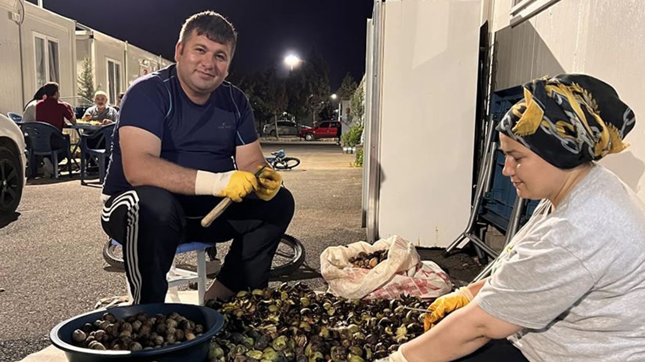 İsmail Kazan isimli depremzede, “Cevizimizi çırptık, kabuğunu soyduk, konteyner çatısında kurutmaya bırakacağız ve kış mevsiminde ise afiyetle yiyeceğiz” dedi.