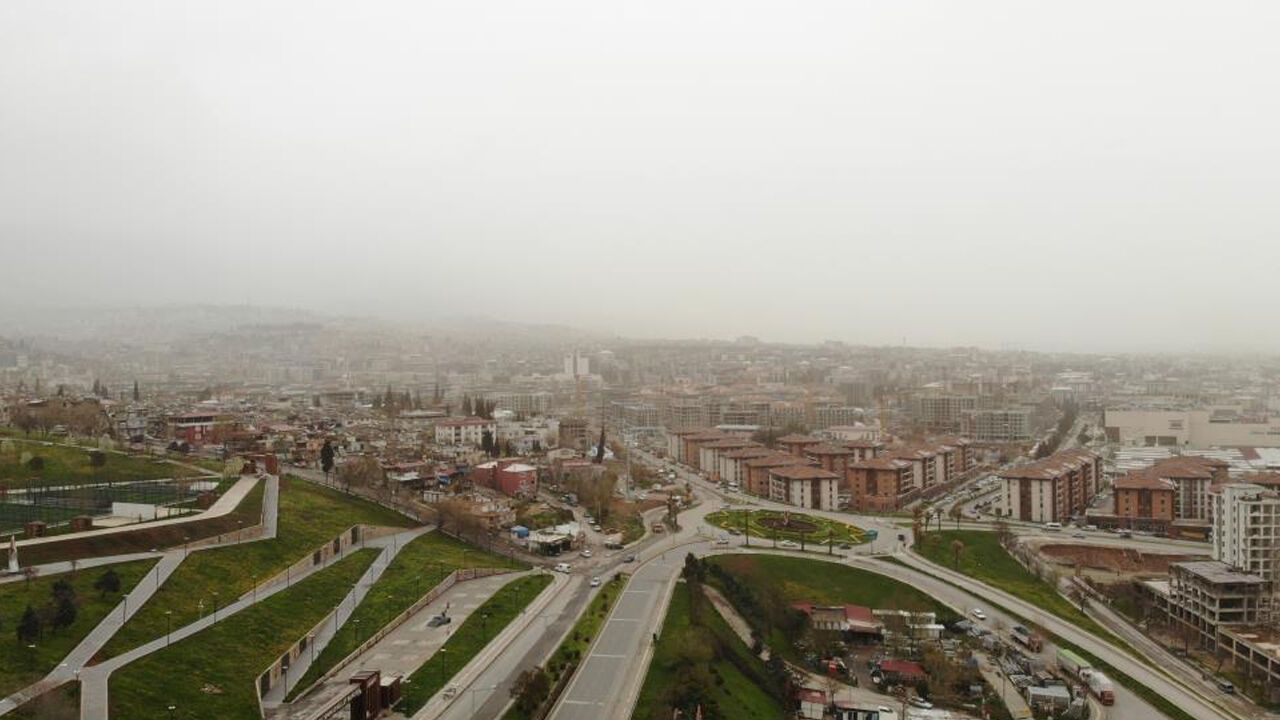 Kahramanmaraş'ta sabah saatlerinde etkili olan sağanak yağmur yerini toz bulutlarına bıraktı. Sahra çölünden rüzgarlarla taşınan toz partikülleri nedeniyle şehir genelinde hava kalitesi düşerken, oluşan puslu hava dron kamerası ile görüntülendi. Kentte etkili olan toz bulutu nedeniyle araçların üzerinin ince bir toz tabakasıyla kaplandığı gözlenirken, gökyüzünde sarımsı ve puslu bir görüntü oluştu. Dron ile kaydedilen görüntülerde, kentin üzerini kaplayan toz bulutu ve görüş mesafesindeki düşüş net şekilde görüldü.