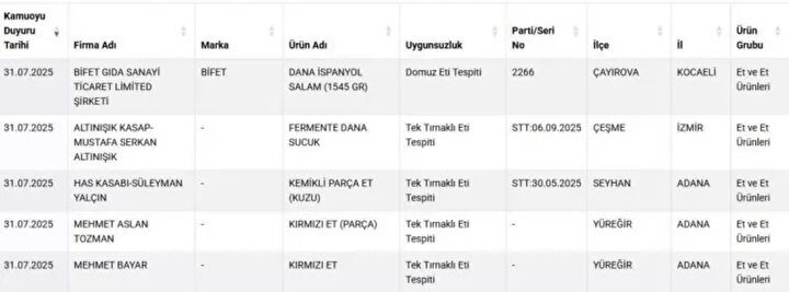 Bakanlığın yayınladığı listede satışa sunulan BİFET markalı 'Dana İspanyol Salam' ürününde domuz eti kullanıldığı tespit edildi. Söz konusu ürünün Türkiye genelinde çok sayıda zincir markette satışa sunulduğu öğrenildi. İçeriğinde 'dana eti' ibaresine yer verilen ancak bileşiğinde domuz eti bulundurduğu tespit edilen ürünler, Tarım ve Orman Bakanlığı'nın yetkilendirdiği ekipler tarafından satış noktalarından acil olarak toplatılıyor.