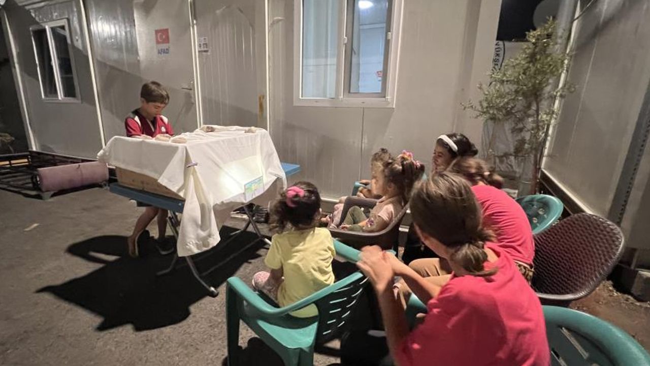 Depremin merkezi Kahramanmaraş'ta sahada çalışmalar sürerken, konteyner kentlerde de yaşam devam ediyor. Merkez Dulkadiroğlu ilçesi Karacasu Konteyner Kent’te de ailelerin her türlü ihtiyacı karşılanıyor. Çocuklar için sürekli etkinlikler yapılan konteyner kette bazen ilginç görüntüler de ortaya çıkıyor. Konteyner kentte yaşayan 10 yaşındaki Ömer Akpınar'da, arkadaşları eğlensin diye kendi imkanları ile mini sinema yaptı. Kartonlarla birleştirip içerisine tabletini bırakan Akpınar, akşam saatlerinde çocuklara çizgi film izleterek keyifli bir etlinlik düzenliyor.