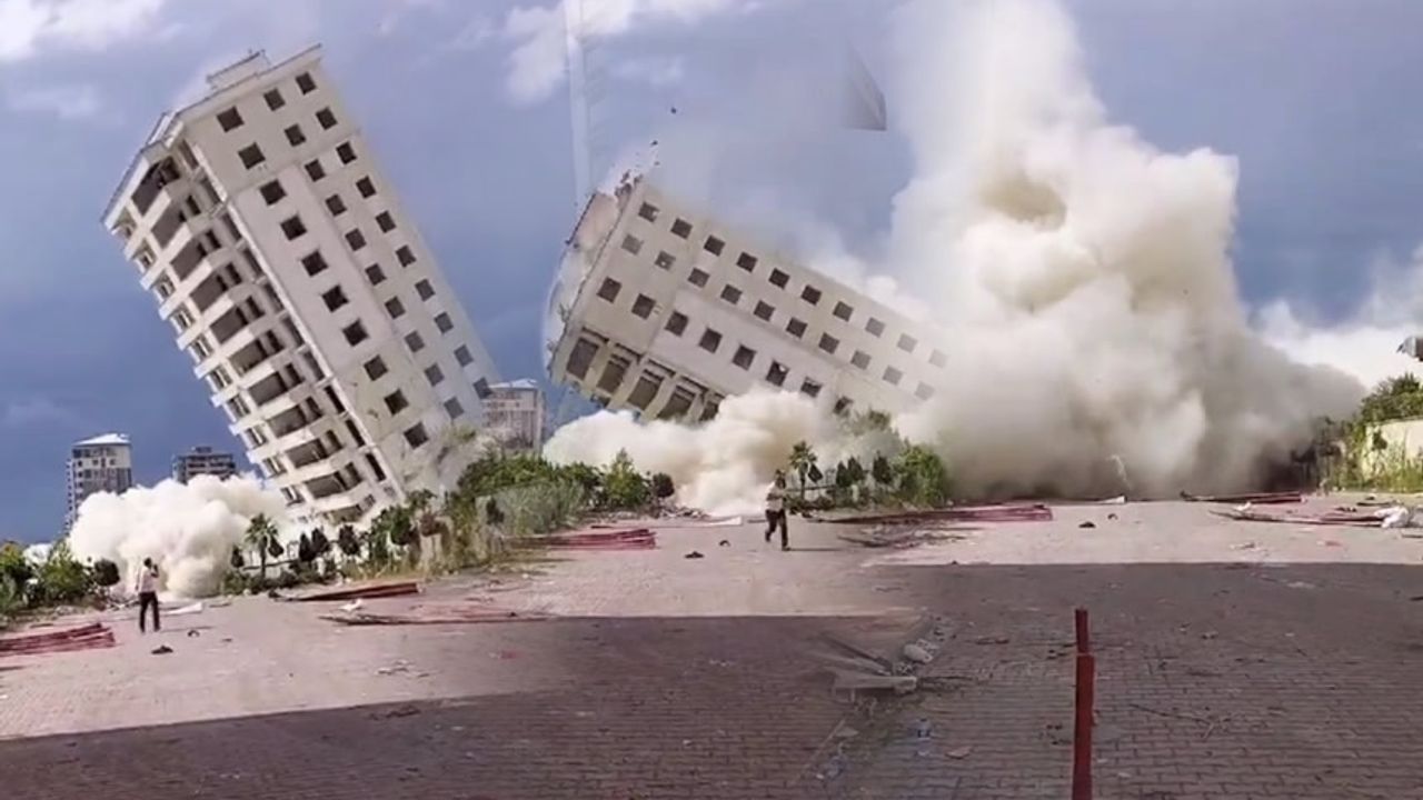 6 Şubat tarihinde Kahramanmaraş merkezli yaşanan 7,7 ve 7,6 şiddetindeki depremlerde ağır hasar alan binaların yıkımı devam ediyor. Merkez Onikişubat ilçesi Üngüt Mahallesi'nde depremlerde ağır hasar gören 15 katlı Batı Şehir Park Sitesi, yıkım sırasında alışılmışın aksine olduğu gibi öne çöktü. Çalışmayı takip eden vatandaşlar binanın yıkımı esnasında kısa süreli panik yaşarken, binanın yıkıldığı anlar bir vatandaşın kamerasına yansıdı.