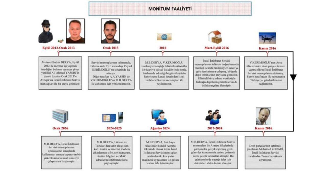 İsrail İstihbarat Servisi mensuplarından aldığı talimat doğrultusunda Veysel Kerimoğlu’nu işe alan ve maaşını bile istihbaratçılardan temin eden Mehmet Budak Derya, arkadaşlık ilişkisi de geliştirdi. M.B. Derya, V. Kerimoğlu ile attıkları her adımı İsrail servisi ile paylaştı. Mehmet Budak Derya, Veysel Kerimoğlu vesilesiyle Orta Doğu ülkelerine yönelik ticari faaliyetlerini arttırdı. Yine V. Kerimoğlu sayesinde tanıştığı, İsrail’in Orta Doğu ülkelerine yönelik politikalarına muhalif Filistinliler ile sosyal ve ticari ilişkilerini geliştirdi. Bu şahıslar hakkında topladığı bilgileri İsrail servisine aktardı. İsrail’in Gazze’yi işgal politikası çerçevesinde tesis ettiği ticari ilişkileri de kullanarak Gazze’ye giriş izni almaya çalıştı. Gazze’de aradığı depoların fotoğraflarını İsrail istihbaratına iletti.