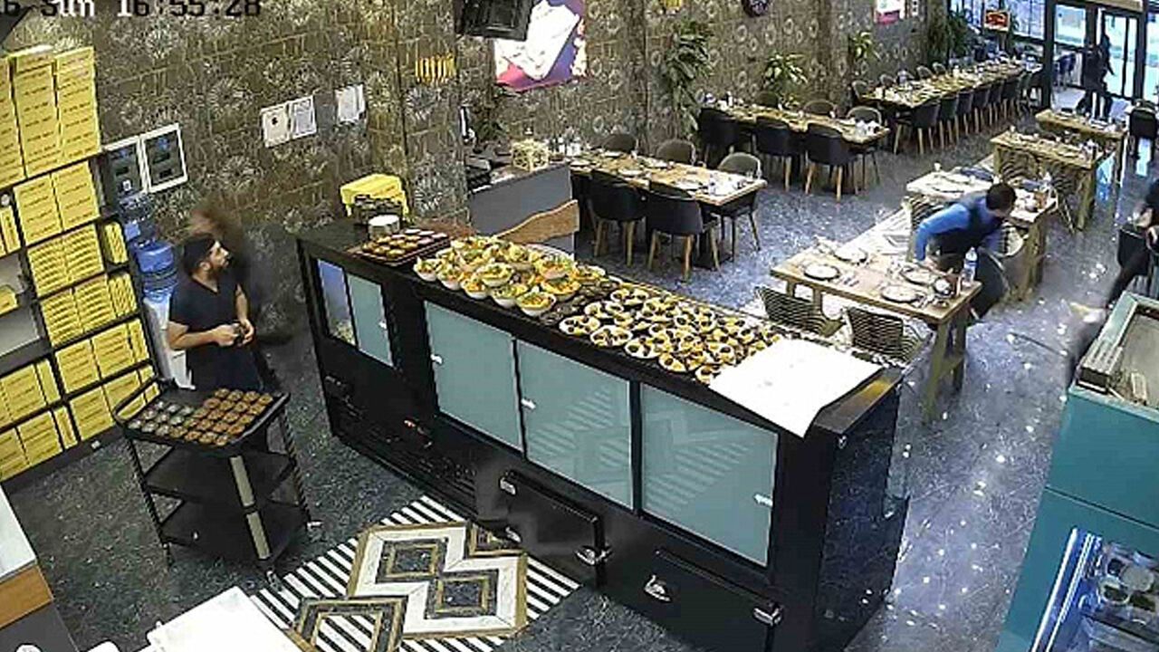 Asma tavanın çökme anı ise iş yerinin güvenlik kamerası tarafından saniye saniye kaydedildi. Görüntülerde; personelin mutfak ve salon kısmında çalıştığı esnada tavanın bir anda aşağı indiği, çalışanların ise güvenli yerlere kaçıştığı görülüyor.