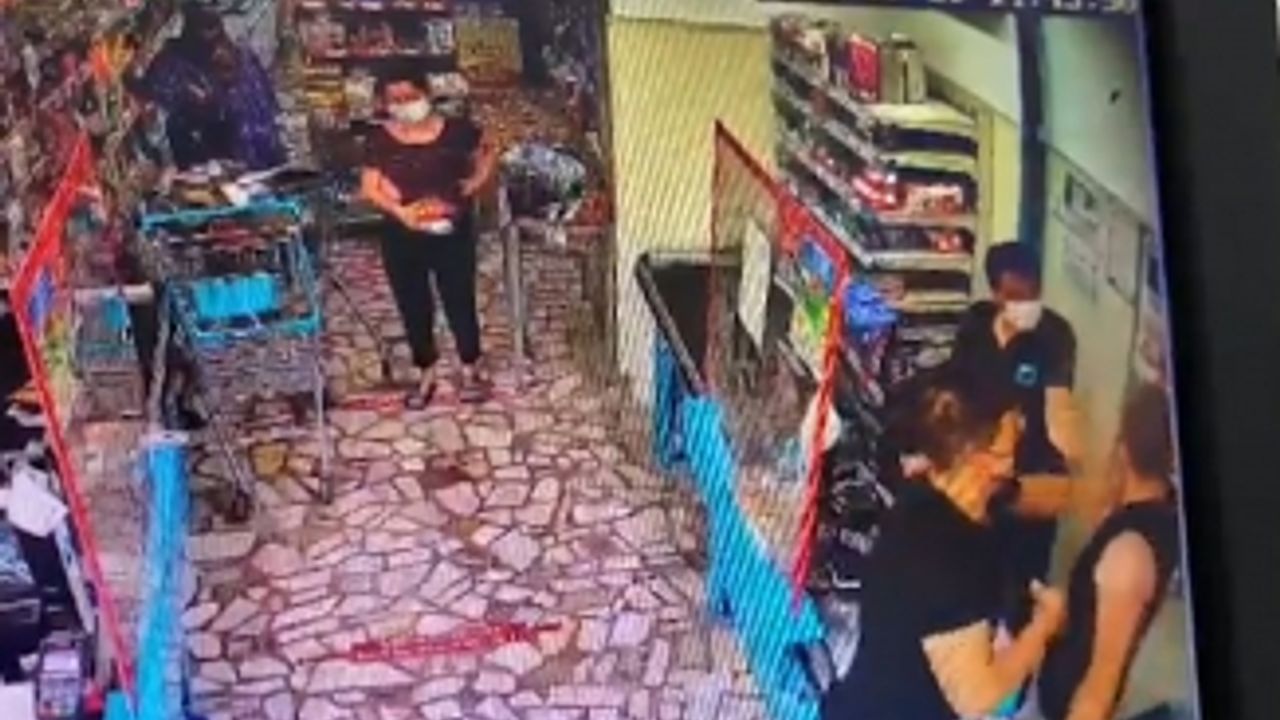 Markete gelen müşteri, kasiyere indirimli ürünleri sordu. 'Maske, duş jeli, ped" yanıtını veren 19 yaşındaki kasiyerin, müşterinin kocası tarafından darbedildiği anlar kameraya yansıdı.