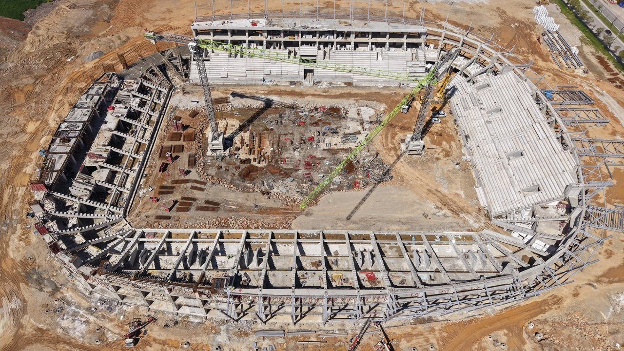 Yeni Kahramanmaraş Stadyumu inşaatında tribün çalışmaları dikkat çekiyor. Kuzey, doğu ve batı tribünlerinde üçüncü kat seviyesine ulaşılırken, güney tribünde ikinci kat tamamlanma aşamasına geldi.