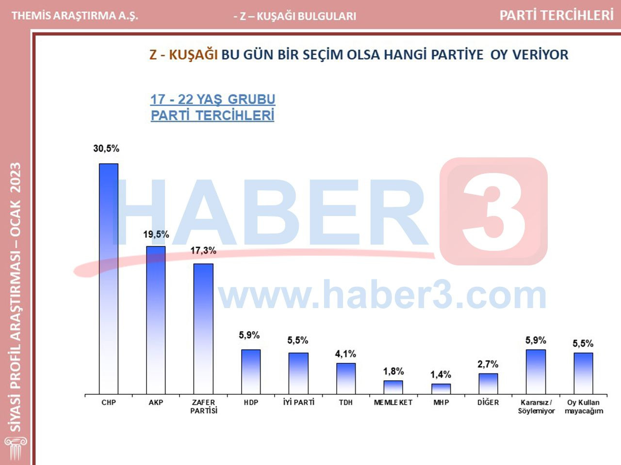 Themis Araştırma tarafından ankete katılanlara sorulan "Bugün bir seçim olsa hangi partiye oy verirsiniz" sorusuna ise verilen yanıtlara göre CHP Yüzde 30, ile birinci parti olurken, AK Parti yüzde 19,5 ile ikinci parti oldu.